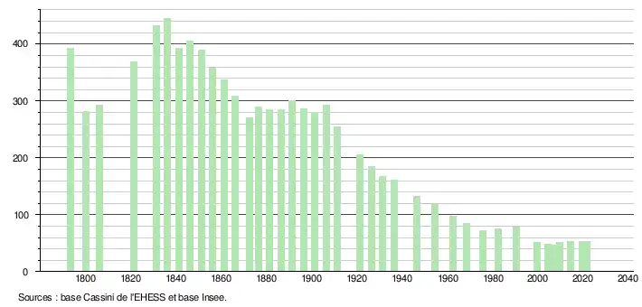 L'évolution du nombre d'habitants est connue à travers les recensements de la population effectués dans la commune depuis 1793. Pour les communes de moins de 10 000 habitants, une enquête de recensement portant sur toute la population est réalisée tous les cinq ans, les populations légales des années intermédiaires étant quant à elles estimées par interpolation ou extrapolation[23]. Pour la commune, le premier recensement exhaustif entrant dans le cadre du nouveau dispositif a été réalisé en 2004[24].