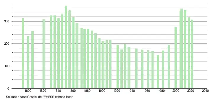 L'évolution du nombre d'habitants est connue à travers les recensements de la population effectués dans la commune depuis 1793. Pour les communes de moins de 10 000 habitants, une enquête de recensement portant sur toute la population est réalisée tous les cinq ans, les populations légales des années intermédiaires étant quant à elles estimées par interpolation ou extrapolation[43]. Pour la commune, le premier recensement exhaustif entrant dans le cadre du nouveau dispositif a été réalisé en 2007[44].