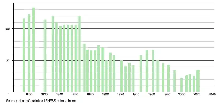 L'évolution du nombre d'habitants est connue à travers les recensements de la population effectués dans la commune depuis 1793. Pour les communes de moins de 10 000 habitants, une enquête de recensement portant sur toute la population est réalisée tous les cinq ans, les populations légales des années intermédiaires étant quant à elles estimées par interpolation ou extrapolation[23]. Pour la commune, le premier recensement exhaustif entrant dans le cadre du nouveau dispositif a été réalisé en 2005[24].