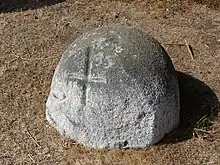 - l'une d'entre elles 90 cm environ, en granit, de forme hémisphérique semble porter la trace de deux christianisations successives. L'une des croix, la plus grande, pourrait dater du VIIe siècle.