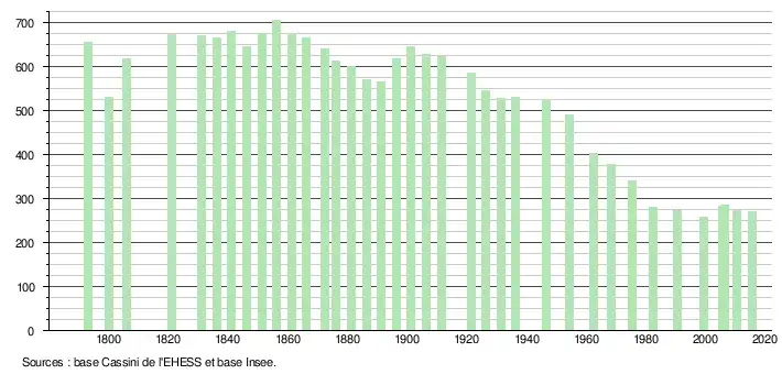 L'évolution du nombre d'habitants est connue à travers les recensements de la population effectués dans la commune depuis 1793. Pour les communes de moins de 10 000 habitants, une enquête de recensement portant sur toute la population est réalisée tous les cinq ans, les populations légales des années intermédiaires étant quant à elles estimées par interpolation ou extrapolation[4]. Pour la commune, le premier recensement exhaustif entrant dans le cadre du nouveau dispositif a été réalisé en 2005[5].