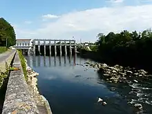 | .JPG.webp)  Le barrage de Tuilières sur la Dordogne, entre Saint-Capraise-de-Lalinde à gauche, et Saint-Agne à droite. | |||||
