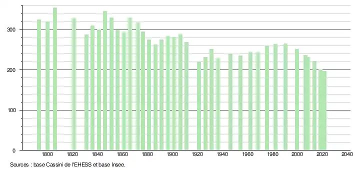 L'évolution du nombre d'habitants est connue à travers les recensements de la population effectués dans la commune depuis 1793. Pour les communes de moins de 10 000 habitants, une enquête de recensement portant sur toute la population est réalisée tous les cinq ans, les populations légales des années intermédiaires étant quant à elles estimées par interpolation ou extrapolation[22]. Pour la commune, le premier recensement exhaustif entrant dans le cadre du nouveau dispositif a été réalisé en 2008[23].
