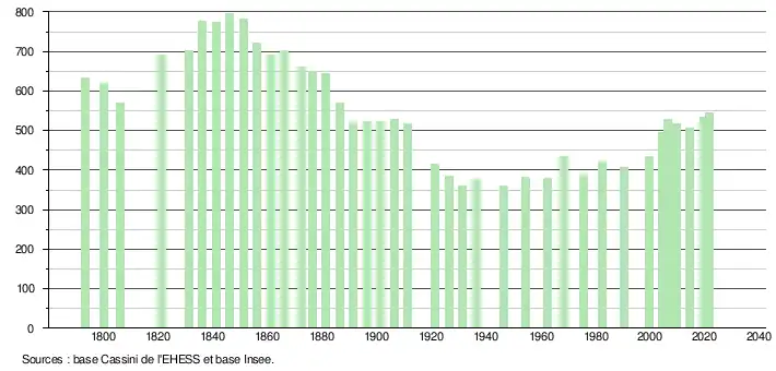L'évolution du nombre d'habitants est connue à travers les recensements de la population effectués dans la commune depuis 1793. Pour les communes de moins de 10 000 habitants, une enquête de recensement portant sur toute la population est réalisée tous les cinq ans, les populations légales des années intermédiaires étant quant à elles estimées par interpolation ou extrapolation[22]. Pour la commune, le premier recensement exhaustif entrant dans le cadre du nouveau dispositif a été réalisé en 2004[23].