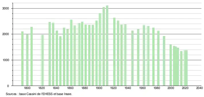 L'évolution du nombre d'habitants est connue à travers les recensements de la population effectués dans la commune depuis 1793. Pour les communes de moins de 10 000 habitants, une enquête de recensement portant sur toute la population est réalisée tous les cinq ans, les populations légales des années intermédiaires étant quant à elles estimées par interpolation ou extrapolation[26]. Pour la commune, le premier recensement exhaustif entrant dans le cadre du nouveau dispositif a été réalisé en 2004[27].