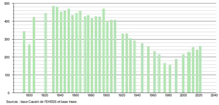 | L'évolution du nombre d'habitants est connue à travers les recensements de la population effectués dans la commune depuis 1793. Pour les communes de moins de 10 000 habitants, une enquête de recensement portant sur toute la population est réalisée tous les cinq ans, les populations légales des années intermédiaires étant quant à elles estimées par interpolation ou extrapolation[43]. Pour la commune, le premier recensement exhaustif entrant dans le cadre du nouveau dispositif a été réalisé en 2007[44]. En 2021, la commune comptait 261 habitants[Note 8], en augmentation de 3,57 % par rapport à 2015 (Ariège : +1,38 %, France hors Mayotte : +1,84 %). |