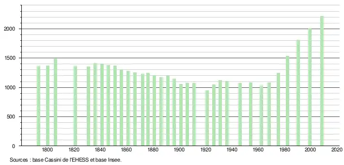 L'évolution du nombre d'habitants est connue à travers les recensements de la population effectués dans la commune depuis 1793. À partir du , les populations légales des communes sont publiées annuellement dans le cadre d'un recensement qui repose désormais sur une collecte d'information annuelle, concernant successivement tous les territoires communaux au cours d'une période de cinq ans. Pour les communes de moins de 10 000 habitants, une enquête de recensement portant sur toute la population est réalisée tous les cinq ans, les populations légales des années intermédiaires étant quant à elles estimées par interpolation ou extrapolation[19]. Pour la commune, le premier recensement exhaustif entrant dans le cadre du nouveau dispositif a été réalisé en 2008[20],[Note 2].