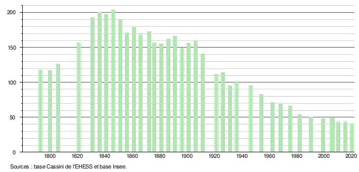 | L'évolution du nombre d'habitants est connue à travers les recensements de la population effectués dans la commune depuis 1793. Pour les communes de moins de 10 000 habitants, une enquête de recensement portant sur toute la population est réalisée tous les cinq ans, les populations légales des années intermédiaires étant quant à elles estimées par interpolation ou extrapolation[44]. Pour la commune, le premier recensement exhaustif entrant dans le cadre du nouveau dispositif a été réalisé en 2005[45]. En 2020, la commune comptait 41 habitants[Note 9], en diminution de 4,65 % par rapport à 2014 (Ariège : +1,38 %, France hors Mayotte : +1,84 %). |
