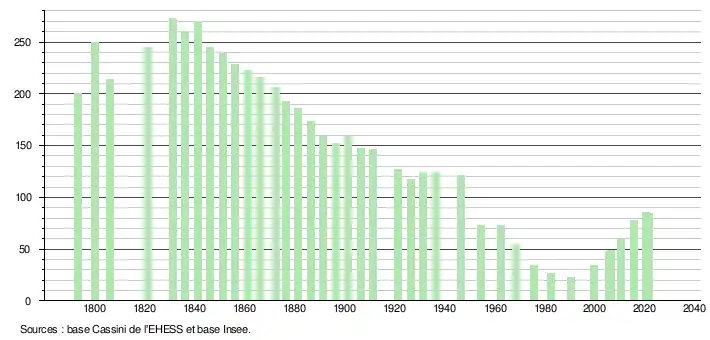 L'évolution du nombre d'habitants est connue à travers les recensements de la population effectués dans la commune depuis 1793. Pour les communes de moins de 10 000 habitants, une enquête de recensement portant sur toute la population est réalisée tous les cinq ans, les populations légales des années intermédiaires étant quant à elles estimées par interpolation ou extrapolation[17]. Pour la commune, le premier recensement exhaustif entrant dans le cadre du nouveau dispositif a été réalisé en 2005[18].