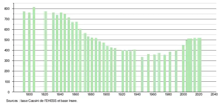 L'évolution du nombre d'habitants est connue à travers les recensements de la population effectués dans la commune depuis 1793. Pour les communes de moins de 10 000 habitants, une enquête de recensement portant sur toute la population est réalisée tous les cinq ans, les populations légales des années intermédiaires étant quant à elles estimées par interpolation ou extrapolation[28]. Pour la commune, le premier recensement exhaustif entrant dans le cadre du nouveau dispositif a été réalisé en 2004[29].