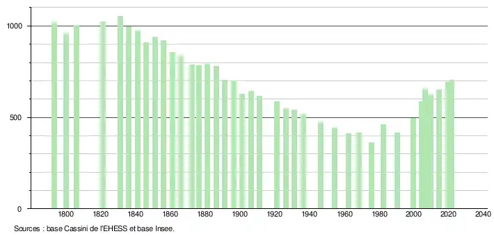 L'évolution du nombre d'habitants est connue à travers les recensements de la population effectués dans la commune depuis 1793. Pour les communes de moins de 10 000 habitants, une enquête de recensement portant sur toute la population est réalisée tous les cinq ans, les populations légales des années intermédiaires étant quant à elles estimées par interpolation ou extrapolation[17]. Pour la commune, le premier recensement exhaustif entrant dans le cadre du nouveau dispositif a été réalisé en 2004[18].
