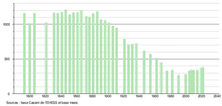 L'évolution du nombre d'habitants est connue à travers les recensements de la population effectués dans la commune depuis 1793. Pour les communes de moins de 10 000 habitants, une enquête de recensement portant sur toute la population est réalisée tous les cinq ans, les populations légales des années intermédiaires étant quant à elles estimées par interpolation ou extrapolation[18]. Pour la commune, le premier recensement exhaustif entrant dans le cadre du nouveau dispositif a été réalisé en 2004[19].