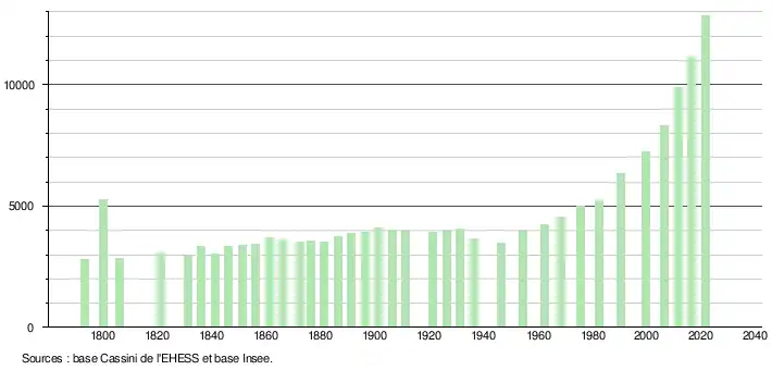 L'évolution du nombre d'habitants est connue à travers les recensements de la population effectués dans la commune depuis 1793. Pour les communes de plus de 10 000 habitants les recensements ont lieu chaque année à la suite d'une enquête par sondage auprès d'un échantillon d'adresses représentant 8 % de leurs logements, contrairement aux autres communes qui ont un recensement réel tous les cinq ans[46],[Note 3].