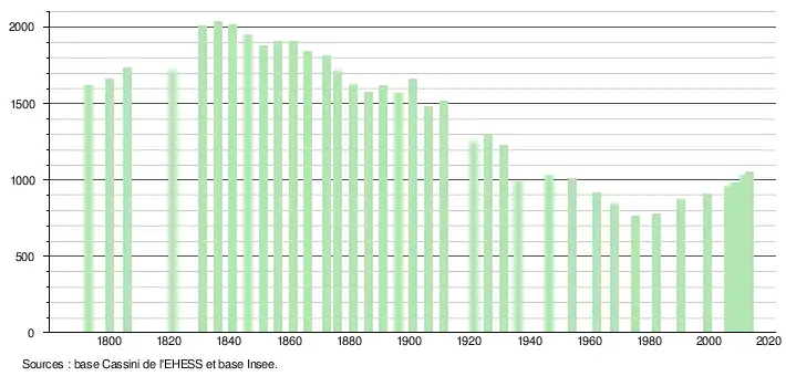 L'évolution du nombre d'habitants est connue à travers les recensements de la population effectués dans la commune depuis 1793. À partir du , les populations légales des communes sont publiées annuellement dans le cadre d'un recensement qui repose désormais sur une collecte d'information annuelle, concernant successivement tous les territoires communaux au cours d'une période de cinq ans. Pour les communes de moins de 10 000 habitants, une enquête de recensement portant sur toute la population est réalisée tous les cinq ans, les populations légales des années intermédiaires étant quant à elles estimées par interpolation ou extrapolation[13]. Pour la commune, le premier recensement exhaustif entrant dans le cadre du nouveau dispositif a été réalisé en [14],[Note 1].