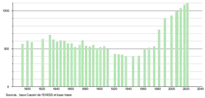 L'évolution du nombre d'habitants est connue à travers les recensements de la population effectués dans la commune depuis 1793. Pour les communes de moins de 10 000 habitants, une enquête de recensement portant sur toute la population est réalisée tous les cinq ans, les populations légales des années intermédiaires étant quant à elles estimées par interpolation ou extrapolation[31]. Pour la commune, le premier recensement exhaustif entrant dans le cadre du nouveau dispositif a été réalisé en 2007[32].