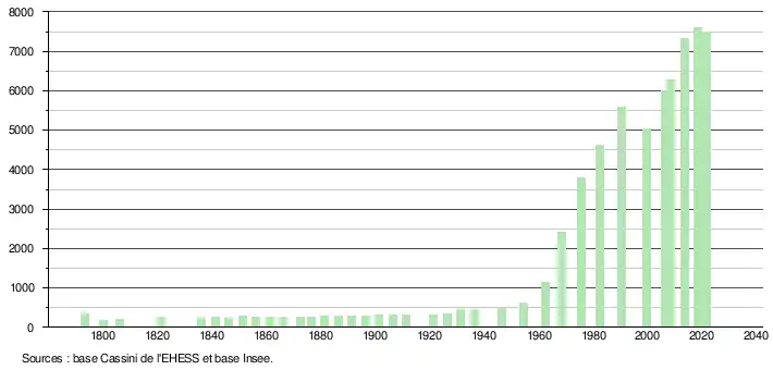 L'évolution du nombre d'habitants est connue à travers les recensements de la population effectués dans la commune depuis 1793. Pour les communes de moins de 10 000 habitants, une enquête de recensement portant sur toute la population est réalisée tous les cinq ans, les populations légales des années intermédiaires étant quant à elles estimées par interpolation ou extrapolation[19]. Pour la commune, le premier recensement exhaustif entrant dans le cadre du nouveau dispositif a été réalisé en 2008[20].