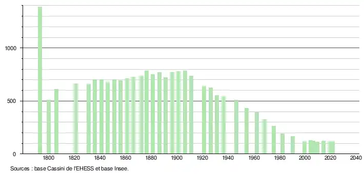 L'évolution du nombre d'habitants est connue à travers les recensements de la population effectués dans la commune depuis 1793. Pour les communes de moins de 10 000 habitants, une enquête de recensement portant sur toute la population est réalisée tous les cinq ans, les populations légales des années intermédiaires étant quant à elles estimées par interpolation ou extrapolation[17]. Pour la commune, le premier recensement exhaustif entrant dans le cadre du nouveau dispositif a été réalisé en 2004[18].