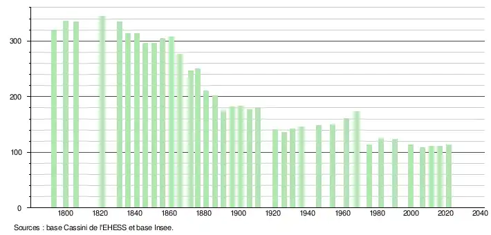 L'évolution du nombre d'habitants est connue à travers les recensements de la population effectués dans la commune depuis 1793. Pour les communes de moins de 10 000 habitants, une enquête de recensement portant sur toute la population est réalisée tous les cinq ans, les populations légales des années intermédiaires étant quant à elles estimées par interpolation ou extrapolation[28]. Pour la commune, le premier recensement exhaustif entrant dans le cadre du nouveau dispositif a été réalisé en 2006[29].