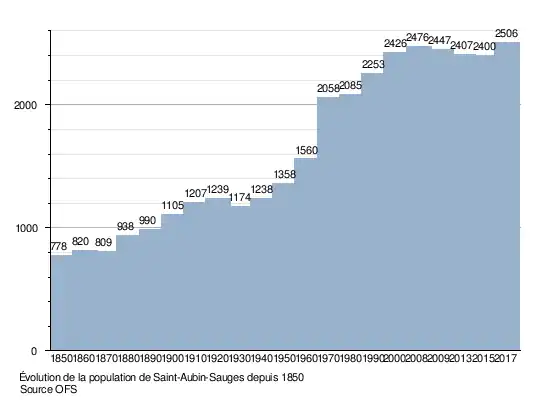 Selon l'Office fédéral de la statistique, Saint-Aubin-Sauges compte 2 399 habitants fin 2022[28]. Sa densité de population atteint 311 hab./km2. Saint-Aubin-Sauges a une population en décembre 2016 de 2 465. En 2008, 21,2 % de la population étaient des ressortissants étrangers résidents. La langue maternelle pour 2054 personne soit 84,7 % de la population est le français, le portugais est la deuxième langue avec 4,4 % de la population et l'allemand est la troisième avec 4,3 %.