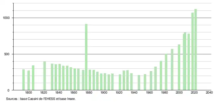 L'évolution du nombre d'habitants est connue à travers les recensements de la population effectués dans la commune depuis 1793. Pour les communes de moins de 10 000 habitants, une enquête de recensement portant sur toute la population est réalisée tous les cinq ans, les populations légales des années intermédiaires étant quant à elles estimées par interpolation ou extrapolation[25]. Pour la commune, le premier recensement exhaustif entrant dans le cadre du nouveau dispositif a été réalisé en 2007[26].