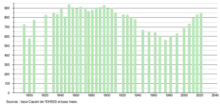 L'évolution du nombre d'habitants est connue à travers les recensements de la population effectués dans la commune depuis 1793. Pour les communes de moins de 10 000 habitants, une enquête de recensement portant sur toute la population est réalisée tous les cinq ans, les populations légales des années intermédiaires étant quant à elles estimées par interpolation ou extrapolation[24]. Pour la commune, le premier recensement exhaustif entrant dans le cadre du nouveau dispositif a été réalisé en 2006[25].