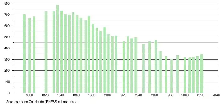 L'évolution du nombre d'habitants est connue à travers les recensements de la population effectués dans la commune depuis 1793. Pour les communes de moins de 10 000 habitants, une enquête de recensement portant sur toute la population est réalisée tous les cinq ans, les populations légales des années intermédiaires étant quant à elles estimées par interpolation ou extrapolation[52]. Pour la commune, le premier recensement exhaustif entrant dans le cadre du nouveau dispositif a été réalisé en 2005[53].
