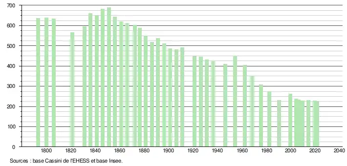 L'évolution du nombre d'habitants est connue à travers les recensements de la population effectués dans la commune depuis 1793. Pour les communes de moins de 10 000 habitants, une enquête de recensement portant sur toute la population est réalisée tous les cinq ans, les populations légales des années intermédiaires étant quant à elles estimées par interpolation ou extrapolation[24]. Pour la commune, le premier recensement exhaustif entrant dans le cadre du nouveau dispositif a été réalisé en 2004[25].