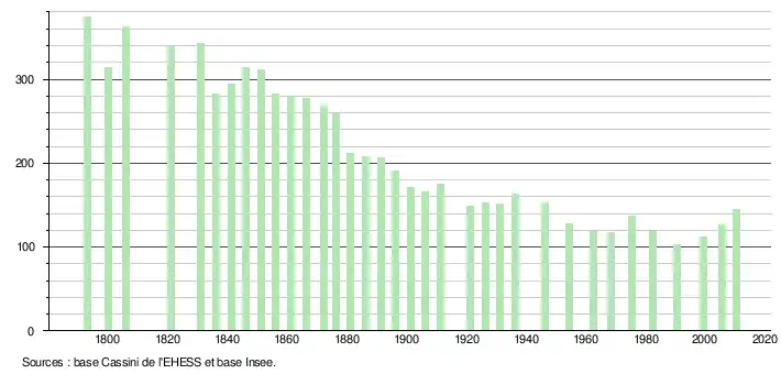 L'évolution du nombre d'habitants est connue à travers les recensements de la population effectués dans la commune depuis 1793. À partir du , les populations légales des communes sont publiées annuellement dans le cadre d'un recensement qui repose désormais sur une collecte d'information annuelle, concernant successivement tous les territoires communaux au cours d'une période de cinq ans. Pour les communes de moins de 10 000 habitants, une enquête de recensement portant sur toute la population est réalisée tous les cinq ans, les populations légales des années intermédiaires étant quant à elles estimées par interpolation ou extrapolation[3]. Pour la commune, le premier recensement exhaustif entrant dans le cadre du nouveau dispositif a été réalisé en 2005[4],[Note 1].