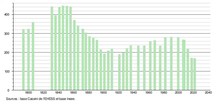 L'évolution du nombre d'habitants est connue à travers les recensements de la population effectués dans la commune depuis 1793. Pour les communes de moins de 10 000 habitants, une enquête de recensement portant sur toute la population est réalisée tous les cinq ans, les populations légales des années intermédiaires étant quant à elles estimées par interpolation ou extrapolation[23]. Pour la commune, le premier recensement exhaustif entrant dans le cadre du nouveau dispositif a été réalisé en 2007[24].