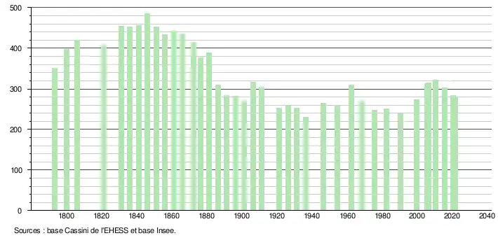 L'évolution du nombre d'habitants est connue à travers les recensements de la population effectués dans la commune depuis 1793. Pour les communes de moins de 10 000 habitants, une enquête de recensement portant sur toute la population est réalisée tous les cinq ans, les populations légales des années intermédiaires étant quant à elles estimées par interpolation ou extrapolation[22]. Pour la commune, le premier recensement exhaustif entrant dans le cadre du nouveau dispositif a été réalisé en 2005[23].