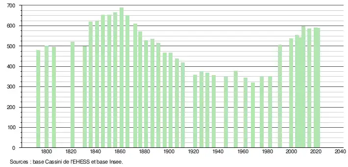 L'évolution du nombre d'habitants est connue à travers les recensements de la population effectués dans la commune depuis 1793. Pour les communes de moins de 10 000 habitants, une enquête de recensement portant sur toute la population est réalisée tous les cinq ans, les populations légales des années intermédiaires étant quant à elles estimées par interpolation ou extrapolation[32]. Pour la commune, le premier recensement exhaustif entrant dans le cadre du nouveau dispositif a été réalisé en 2004[33].