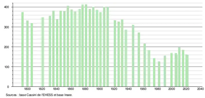 L'évolution du nombre d'habitants est connue à travers les recensements de la population effectués dans la commune depuis 1793. Pour les communes de moins de 10 000 habitants, une enquête de recensement portant sur toute la population est réalisée tous les cinq ans, les populations légales des années intermédiaires étant quant à elles estimées par interpolation ou extrapolation[34]. Pour la commune, le premier recensement exhaustif entrant dans le cadre du nouveau dispositif a été réalisé en 2005[35].