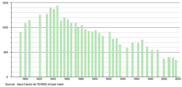 L'évolution du nombre d'habitants est connue à travers les recensements de la population effectués dans la commune depuis 1793. Pour les communes de moins de 10 000 habitants, une enquête de recensement portant sur toute la population est réalisée tous les cinq ans, les populations légales des années intermédiaires étant quant à elles estimées par interpolation ou extrapolation[19]. Pour la commune, le premier recensement exhaustif entrant dans le cadre du nouveau dispositif a été réalisé en 2007[20].