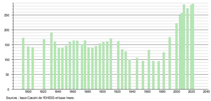 L'évolution du nombre d'habitants est connue à travers les recensements de la population effectués dans la commune depuis 1793. Pour les communes de moins de 10 000 habitants, une enquête de recensement portant sur toute la population est réalisée tous les cinq ans, les populations légales des années intermédiaires étant quant à elles estimées par interpolation ou extrapolation[18]. Pour la commune, le premier recensement exhaustif entrant dans le cadre du nouveau dispositif a été réalisé en 2004[19].