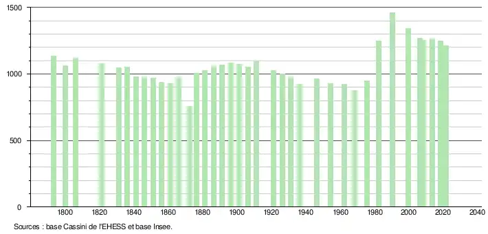 L'évolution du nombre d'habitants est connue à travers les recensements de la population effectués dans la commune depuis 1793. Pour les communes de moins de 10 000 habitants, une enquête de recensement portant sur toute la population est réalisée tous les cinq ans, les populations légales des années intermédiaires étant quant à elles estimées par interpolation ou extrapolation[22]. Pour la commune, le premier recensement exhaustif entrant dans le cadre du nouveau dispositif a été réalisé en 2008[23].