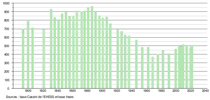 L'évolution du nombre d'habitants est connue à travers les recensements de la population effectués dans la commune depuis 1793. Pour les communes de moins de 10 000 habitants, une enquête de recensement portant sur toute la population est réalisée tous les cinq ans, les populations légales des années intermédiaires étant quant à elles estimées par interpolation ou extrapolation[52]. Pour la commune, le premier recensement exhaustif entrant dans le cadre du nouveau dispositif a été réalisé en 2004[53].