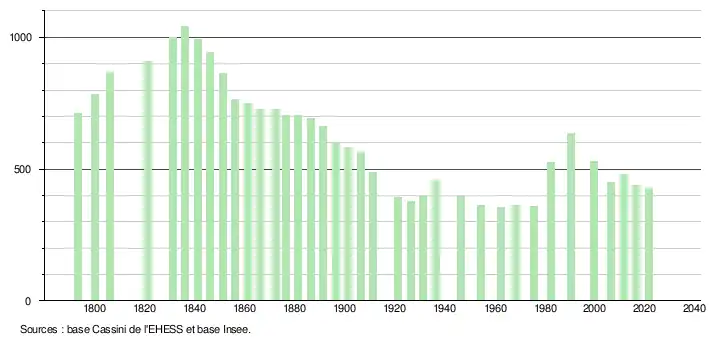 L'évolution du nombre d'habitants est connue à travers les recensements de la population effectués dans la commune depuis 1793. Pour les communes de moins de 10 000 habitants, une enquête de recensement portant sur toute la population est réalisée tous les cinq ans, les populations légales des années intermédiaires étant quant à elles estimées par interpolation ou extrapolation[17]. Pour la commune, le premier recensement exhaustif entrant dans le cadre du nouveau dispositif a été réalisé en 2006[18].