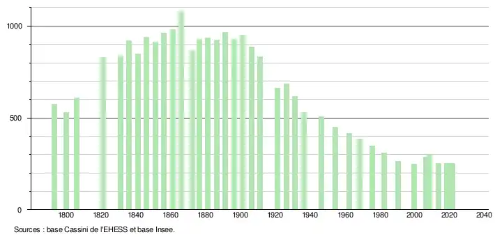 L'évolution du nombre d'habitants est connue à travers les recensements de la population effectués dans la commune depuis 1793. Pour les communes de moins de 10 000 habitants, une enquête de recensement portant sur toute la population est réalisée tous les cinq ans, les populations légales des années intermédiaires étant quant à elles estimées par interpolation ou extrapolation[25]. Pour la commune, le premier recensement exhaustif entrant dans le cadre du nouveau dispositif a été réalisé en 2008[26].