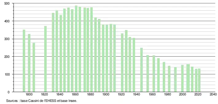 | L'évolution du nombre d'habitants est connue à travers les recensements de la population effectués dans la commune depuis 1793. Pour les communes de moins de 10 000 habitants, une enquête de recensement portant sur toute la population est réalisée tous les cinq ans, les populations légales des années intermédiaires étant quant à elles estimées par interpolation ou extrapolation[22]. Pour la commune, le premier recensement exhaustif entrant dans le cadre du nouveau dispositif a été réalisé en 2007[23]. En 2021, la commune comptait 132 habitants[Note 3], en diminution de 2,22 % par rapport à 2015 (Corrèze : −0,86 %, France hors Mayotte : +1,84 %). |