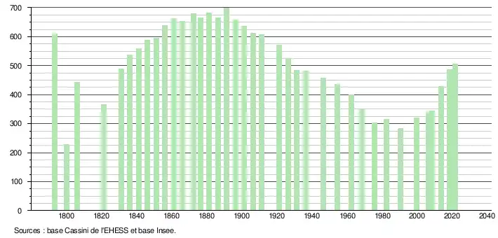 L'évolution du nombre d'habitants est connue à travers les recensements de la population effectués dans la commune depuis 1793. Pour les communes de moins de 10 000 habitants, une enquête de recensement portant sur toute la population est réalisée tous les cinq ans, les populations légales des années intermédiaires étant quant à elles estimées par interpolation ou extrapolation[20]. Pour la commune, le premier recensement exhaustif entrant dans le cadre du nouveau dispositif a été réalisé en 2008[21].