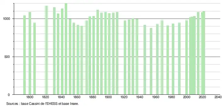 L'évolution du nombre d'habitants est connue à travers les recensements de la population effectués dans la commune depuis 1793. Pour les communes de moins de 10 000 habitants, une enquête de recensement portant sur toute la population est réalisée tous les cinq ans, les populations légales des années intermédiaires étant quant à elles estimées par interpolation ou extrapolation[15]. Pour la commune, le premier recensement exhaustif entrant dans le cadre du nouveau dispositif a été réalisé en 2004[16].