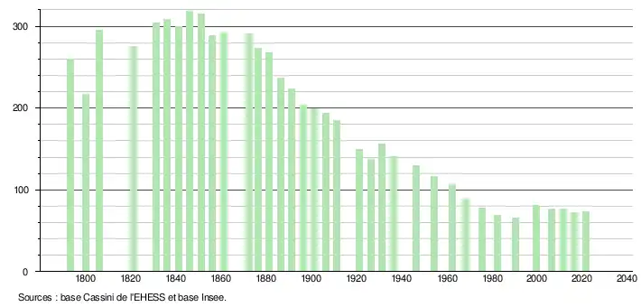 L'évolution du nombre d'habitants est connue à travers les recensements de la population effectués dans la commune depuis 1793. Pour les communes de moins de 10 000 habitants, une enquête de recensement portant sur toute la population est réalisée tous les cinq ans, les populations légales des années intermédiaires étant quant à elles estimées par interpolation ou extrapolation[20]. Pour la commune, le premier recensement exhaustif entrant dans le cadre du nouveau dispositif a été réalisé en 2006[21].