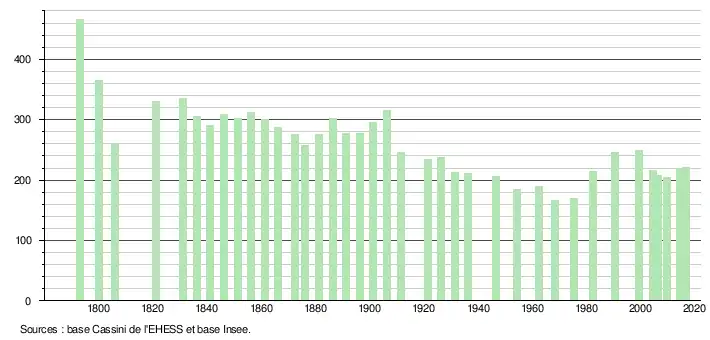 L'évolution du nombre d'habitants est connue à travers les recensements de la population effectués dans la commune depuis 1793. Pour les communes de moins de 10 000 habitants, une enquête de recensement portant sur toute la population est réalisée tous les cinq ans, les populations légales des années intermédiaires étant quant à elles estimées par interpolation ou extrapolation[3]. Pour la commune, le premier recensement exhaustif entrant dans le cadre du nouveau dispositif a été réalisé en 2004[4].