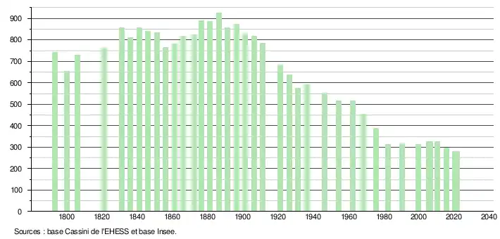 L'évolution du nombre d'habitants est connue à travers les recensements de la population effectués dans la commune depuis 1793. Pour les communes de moins de 10 000 habitants, une enquête de recensement portant sur toute la population est réalisée tous les cinq ans, les populations légales des années intermédiaires étant quant à elles estimées par interpolation ou extrapolation[17]. Pour la commune, le premier recensement exhaustif entrant dans le cadre du nouveau dispositif a été réalisé en 2005[18].