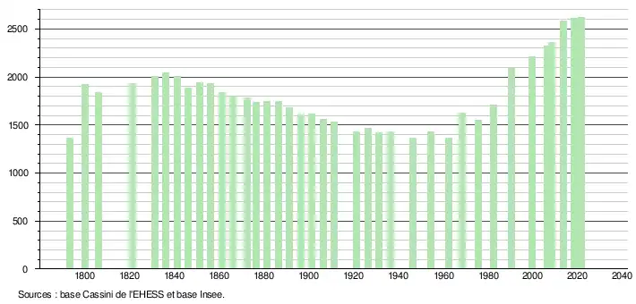 L'évolution du nombre d'habitants est connue à travers les recensements de la population effectués dans la commune depuis 1793. Pour les communes de moins de 10 000 habitants, une enquête de recensement portant sur toute la population est réalisée tous les cinq ans, les populations légales des années intermédiaires étant quant à elles estimées par interpolation ou extrapolation[28]. Pour la commune, le premier recensement exhaustif entrant dans le cadre du nouveau dispositif a été réalisé en 2008[29].