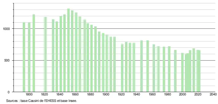L'évolution du nombre d'habitants est connue à travers les recensements de la population effectués dans la commune depuis 1793. Pour les communes de moins de 10 000 habitants, une enquête de recensement portant sur toute la population est réalisée tous les cinq ans, les populations légales des années intermédiaires étant quant à elles estimées par interpolation ou extrapolation[21]. Pour la commune, le premier recensement exhaustif entrant dans le cadre du nouveau dispositif a été réalisé en 2004[22].