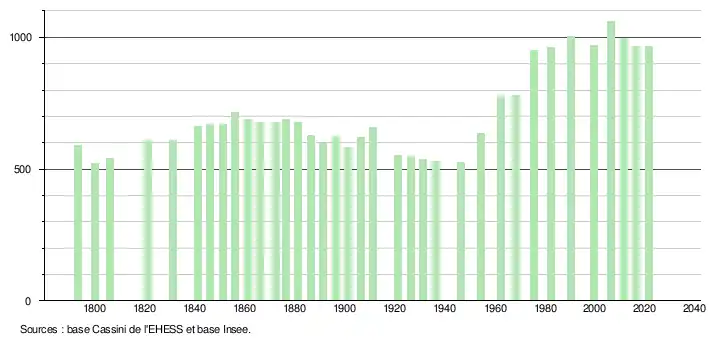 L'évolution du nombre d'habitants est connue à travers les recensements de la population effectués dans la commune depuis 1793. Pour les communes de moins de 10 000 habitants, une enquête de recensement portant sur toute la population est réalisée tous les cinq ans, les populations légales des années intermédiaires étant quant à elles estimées par interpolation ou extrapolation[35]. Pour la commune, le premier recensement exhaustif entrant dans le cadre du nouveau dispositif a été réalisé en 2006[36].