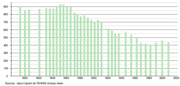 L'évolution du nombre d'habitants est connue à travers les recensements de la population effectués dans la commune depuis 1793. À partir du , les populations légales des communes sont publiées annuellement dans le cadre d'un recensement qui repose désormais sur une collecte d'information annuelle, concernant successivement tous les territoires communaux au cours d'une période de cinq ans. Pour les communes de moins de 10 000 habitants, une enquête de recensement portant sur toute la population est réalisée tous les cinq ans, les populations légales des années intermédiaires étant quant à elles estimées par interpolation ou extrapolation[7]. Pour la commune, le premier recensement exhaustif entrant dans le cadre du nouveau dispositif a été réalisé en 2008[8],[Note 2].