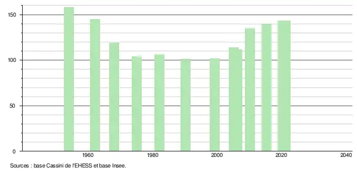 | L'évolution du nombre d'habitants est connue à travers les recensements de la population effectués dans la commune depuis 1954. Pour les communes de moins de 10 000 habitants, une enquête de recensement portant sur toute la population est réalisée tous les cinq ans, les populations légales des années intermédiaires étant quant à elles estimées par interpolation ou extrapolation[29]. Pour la commune, le premier recensement exhaustif entrant dans le cadre du nouveau dispositif a été réalisé en 2005[30]. En 2021, la commune comptait 143 habitants[Note 6], en augmentation de 2,14 % par rapport à 2015 (Gers : +0,79 %, France hors Mayotte : +1,84 %). |
