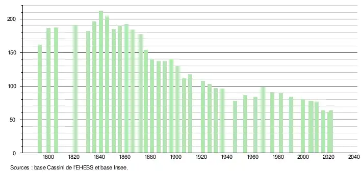 L'évolution du nombre d'habitants est connue à travers les recensements de la population effectués dans la commune depuis 1793. Pour les communes de moins de 10 000 habitants, une enquête de recensement portant sur toute la population est réalisée tous les cinq ans, les populations légales des années intermédiaires étant quant à elles estimées par interpolation ou extrapolation[18]. Pour la commune, le premier recensement exhaustif entrant dans le cadre du nouveau dispositif a été réalisé en 2005[19].